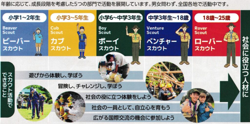 ボーイスカウトは子供たちの家庭、学校以外の「第3の居場所」になります。園児(年長組)から成人までの異年齢の交流や自然のなかで育まれる「好奇心」、「冒険心」や「社会性」は一生涯の「宝」になると思います。